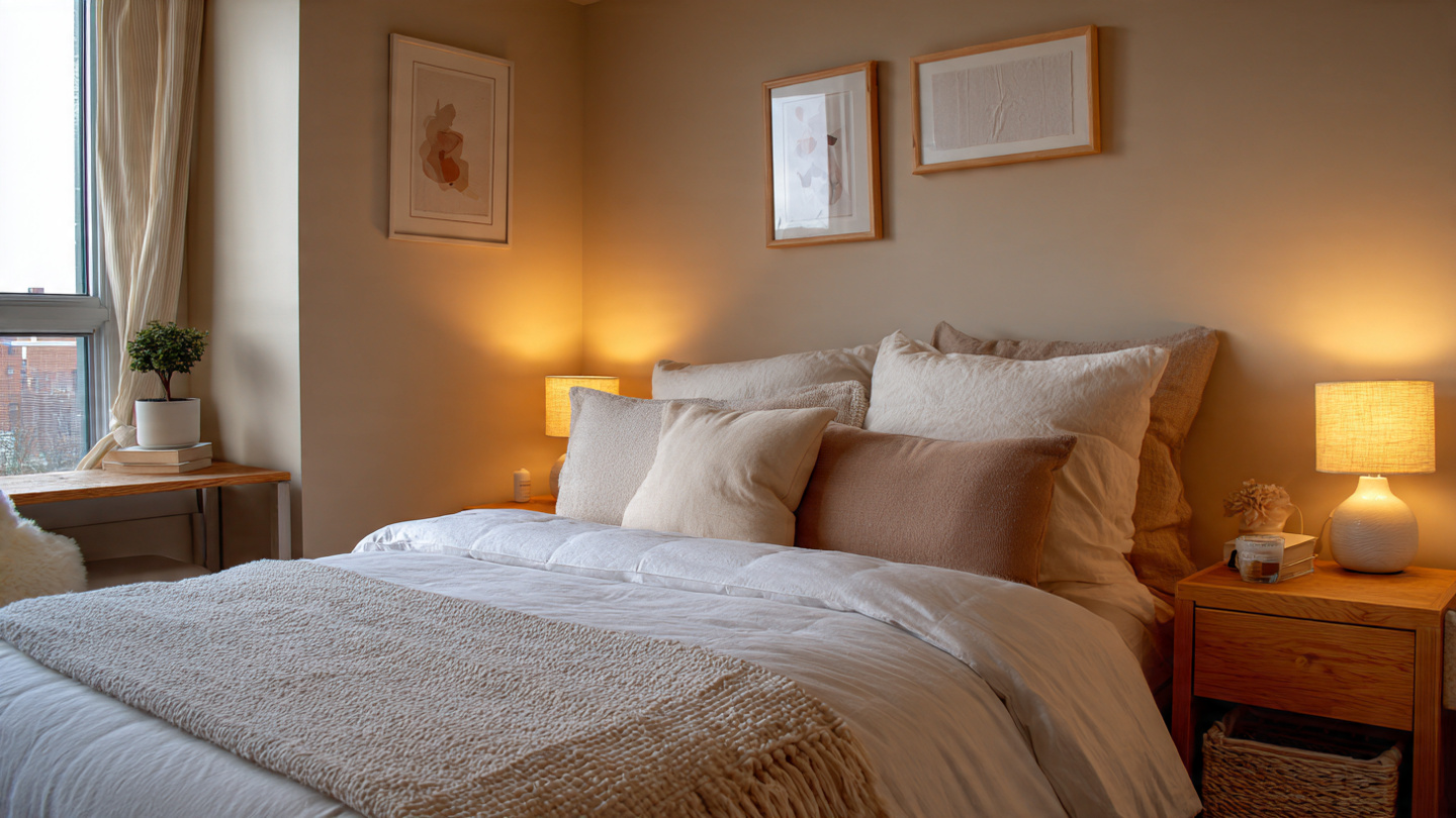 A warm central fixture on a dimmer. Matching bedside lamps with warm bulbs (2700K or lower) and shades that diffuse light softly. Wall sconces if the room permits. A string of warm fairy lights along the headboard or in a canopy above the bed. Each source adds a layer of warmth and each layer makes the room more intimate than the last.