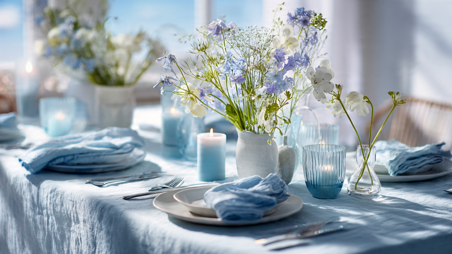 Pick the blue tone that feels most like your space and start building from there. One tablecloth, one set of flowers, one clear palette.