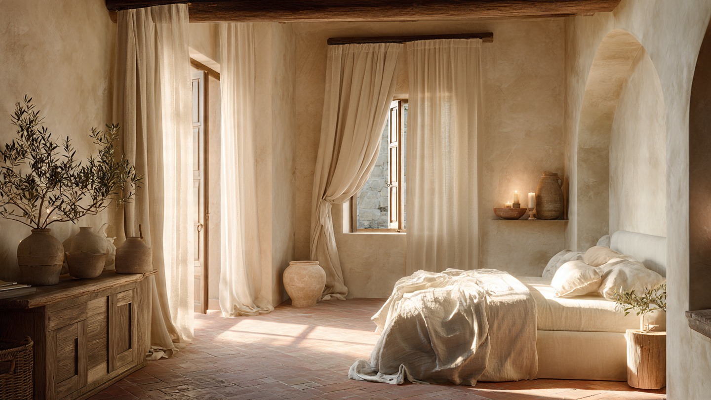 If your bedroom has standard windows, dress them in a way that references arched Italian architecture. Install curtain rods that arc gently at the top, or use elongated curtain panels with a soft gathered heading that suggests height and curvature.