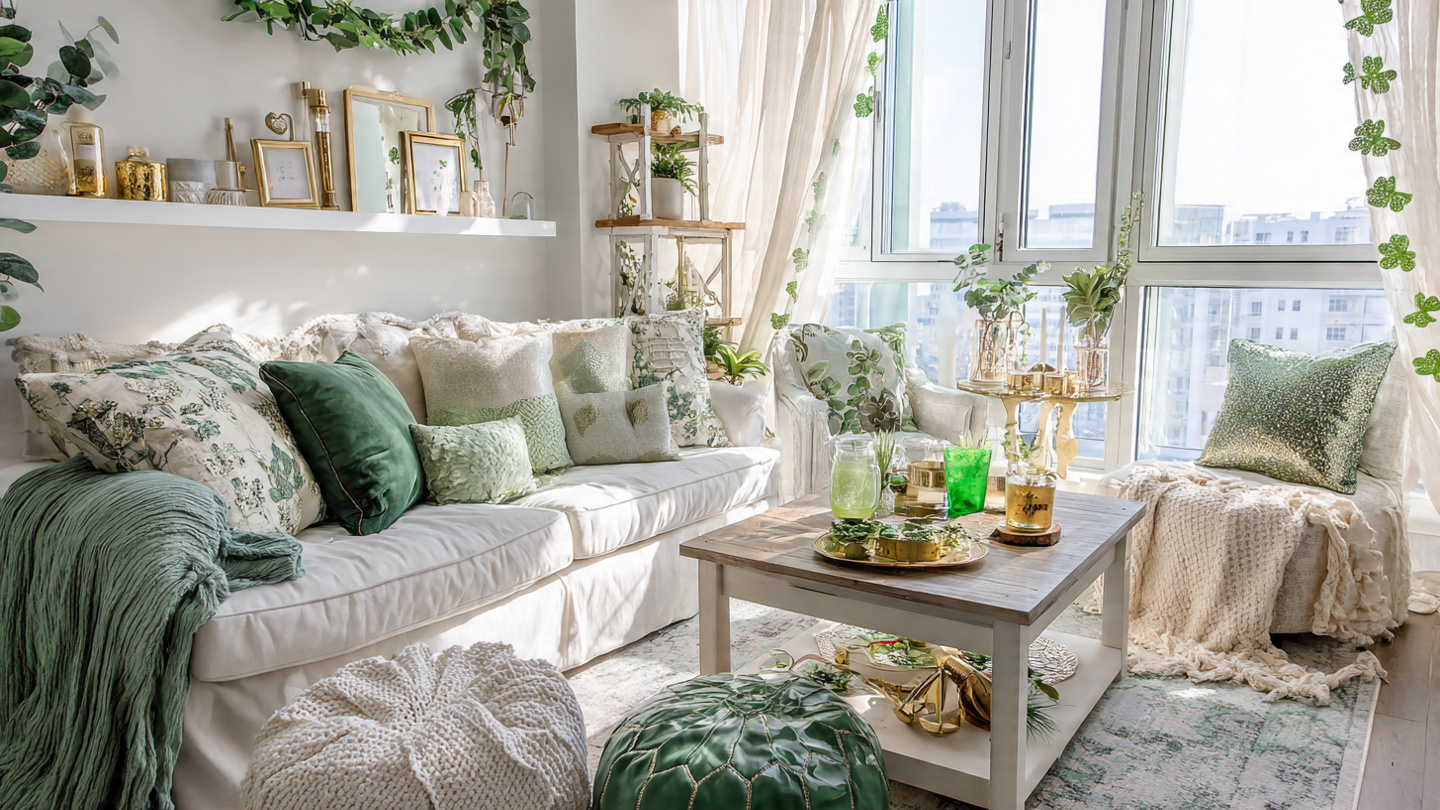 Swapping existing living room cushions and throws for green alternatives is the fastest and most affordable whole-room St. Patrick’s Day transformation. The color change affects the entire room’s atmosphere immediately.